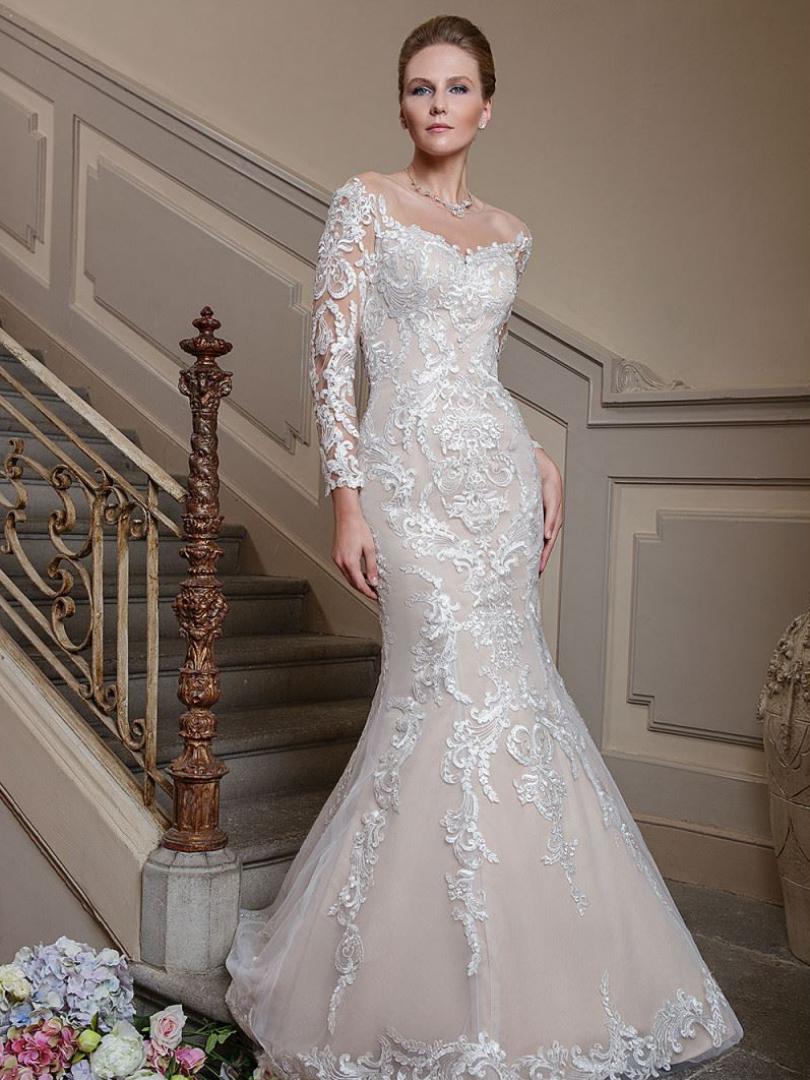 Wie der Name bereits verrät, fallen Brautkleider im Meerjungfrau Stil vor allem durch das besonders geschnittene untere Ende des Rocks auf. Bis zu den Knien liegt das Kleid eng an und betont die weibliche Figur mit seinen Rundungen und einer schmalen Taille. Im unteren Teil verbreitert sich der Rock, wodurch die Ähnlichkeit mit einer Meerjungfrauenflosse entsteht. In der Regel sind Hochzeitskleider im Meerjungfrau Stil sehr lang, sodass der besondere Effekt durch das Aufliegen des Stoffes auf dem Boden verstärkt wird - schlichte Varianten des Modells belassen es dabei. Extravagante Modelle verstärken die Wirkung bewusst durch eine lange Schleppe, zusätzliche Stofflagen, transparente Stoffe, einen Materialmix oder Stickereien. Brautkleider Modelle im Meerjungfrau Stil eignen sich für zierliche oder schlanke Frauen, die eine weibliche Silhouette betonen möchten. Insbesondere große Frauen können diesen Look gut tragen.