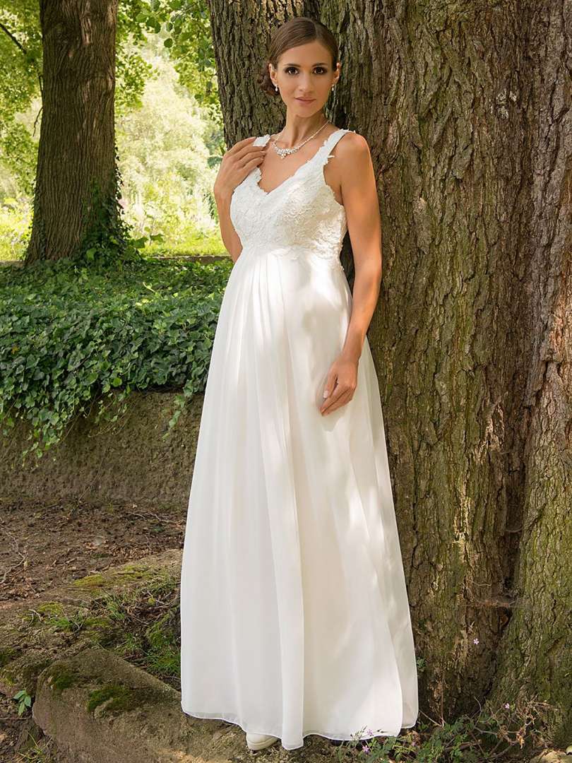 Brautkleider im Empire Stil lassen ihre Trägerinnen wie Göttinnen aussehen. Der Schnitt ist bestimmt durch eine sehr hohe Taillennaht direkt unter der Brust. Sie wird meist hervorgehoben durch ein farbiges Band, Stickereien oder andere Schmuckelemente. Darunter fällt der Rock leicht und fließend. Das kurze Oberteil kann in seiner Gestaltung sehr unterschiedlich sein: zurückhaltend oder detailreich verziert, eng anliegend oder luftig-locker, mit oder ohne Träger und Ärmel, eventuell auch farblich abgesetzt. Das Hochzeitskleid im Empire Stil kann sehr gut übliche Problemzonen wie Bauch, Beine und Po kaschieren - sie verschwinden unter dem lockeren Rock. Der Oberkörper schmaler und zierlicher Frauen wird durch das Oberteil des Empire Kleides sehr gut in Szene gesetzt. Auch für Frauen, die bei ihrer Hochzeit schwanger sind, ist das Kleid im Empire Stil perfekt geeignet: Es sitzt sehr bequem und der Bund direkt unter der Brust stört den Baby Bauch nicht. Zudem unterstreicht der fallende Stoff die wunderschöne Weiblichkeit der Braut und werdenden Mutter.