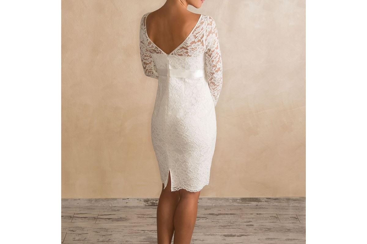 Der Babybauch wächst, doch die eigentliche Konfektionsgröße der Braut ändert sich kaum. Deswegen ergibt es wenig Sinn, ein normales Brautkleid einfach nur eine oder zwei Nummern größer zu kaufen. Bei Hochzeitskleidern für Schwangere ist ein Umstandskleid die bessere Wahl, denn hier entspricht die Konfektionsgröße Ihrer eigentlichen Größe. Der richtige Schnitt oder ein wenig Materialzugabe im Bauchbereich sorgen dafür, dass das Kleid wunderbar fällt und Sie dennoch genug Bewegungsfreiheit haben, um ganz unbeschwert zu heiraten.