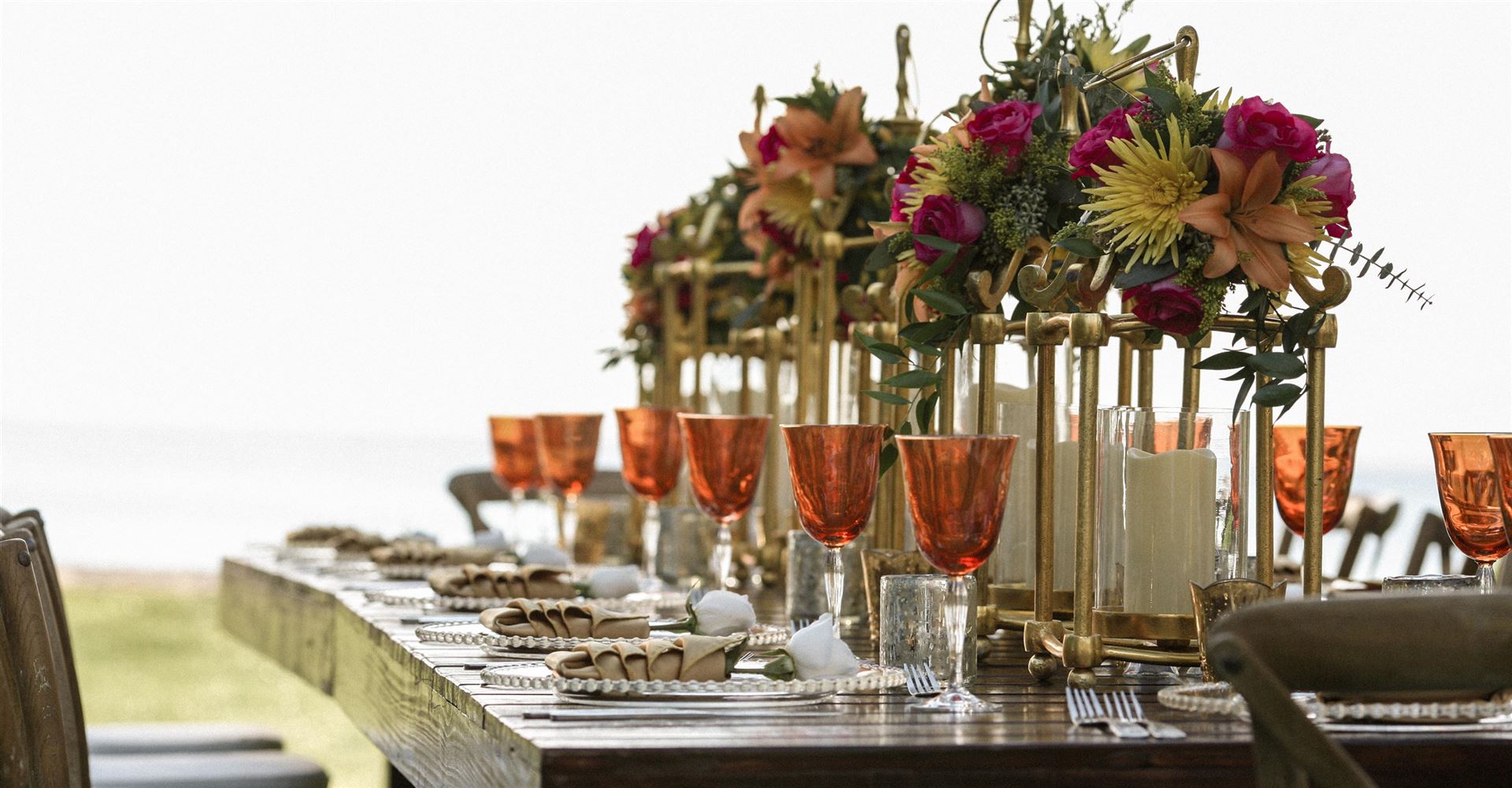 Bunte Blumen wirken belebend auf dunklem Holz. Die Messing-Blumenständer sind leichtfüßig und edel. Das Orange der der Gläser gibt einen sommerlich-verspielten Touch.
